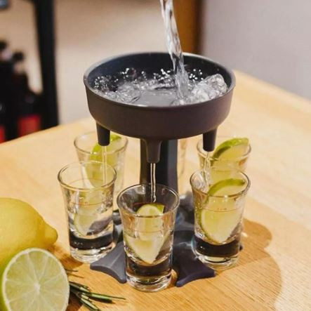 Funciona a modo de embudo: coloque la bebida en la parte ancha de arriba y ésta se irá distribuyendo uniformemente por todos los vasos.