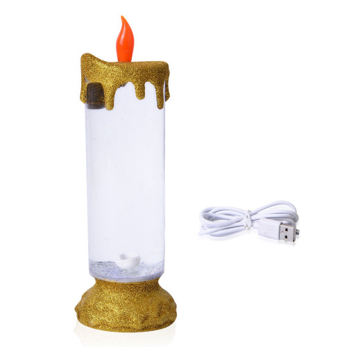 Comprar Lámpara modelo vela con purpurina. Al encenderla la parte de arriba hace como si fuera una llama. El cilindro muestra un juego del agua con purpurina tipo remolino con cambio de color.