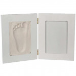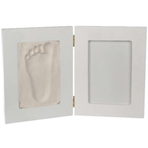 Se trata de un marco doble en el cual podrá poner de un lado una foto y del otro hacer un estampación de la huella del pie o la mano del bebé.