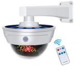 Se enciende automáticamente por las noches, con un piloto rojo que simula la cámara.