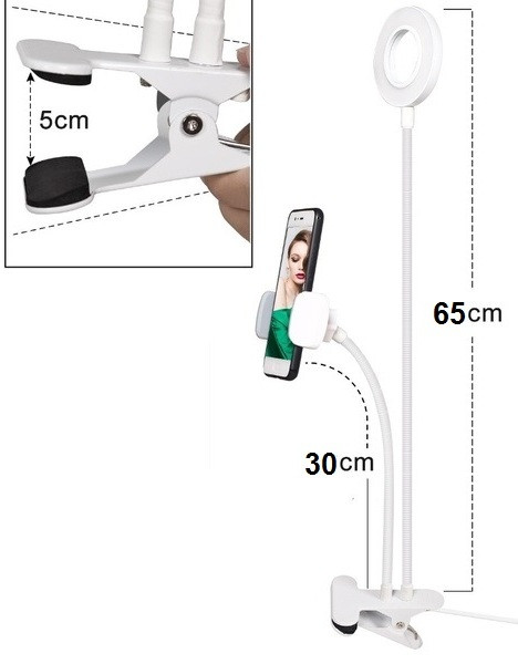 Se trata de un soporte de móvil con aro de luz LED incluido, con gancho tipo pinza para sujetarlo de la mesa o cualquier otro soporte.