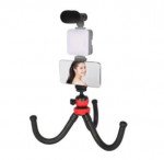 Incluye: soporte que se puede usar de mano o como pequeño trípode de patas flexibles que se adaptan a muchas superficies distintas, micrófono (conectado al teléfono por jack), luz LED (49R) y mando a distancia.