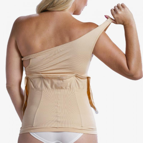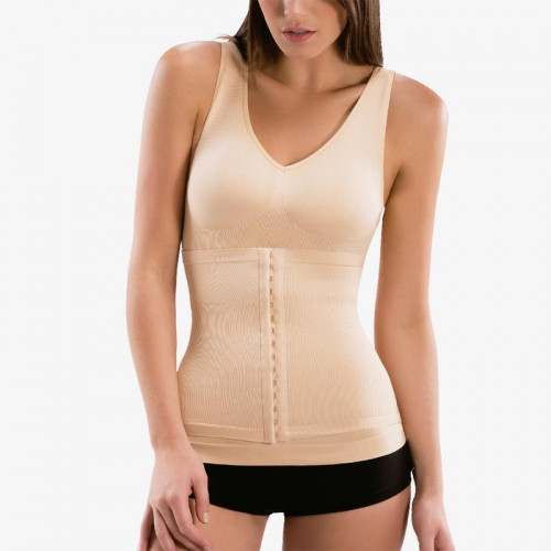 Se trata de una faja tipo camiseta, pero lo mejor es que en la zona de la cintura tiene broches para ajustar esa área al máximo y estilizar mucho más su figura.