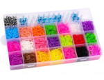 Incluye cientos de gomas de distintos colores, colgantes, clips y base para trenzar.