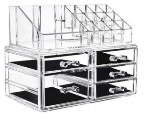 Comprar Organizador de cosméticos con 5 cajones. Fabricado en acrílico transparente. Tiene la parte superior desmontable con diferentes compartimientos. Más información -