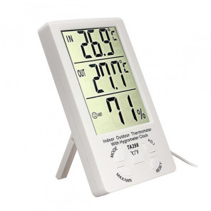Comprar Termómetro / Higrómetro digital. Para medir la temperatura interior y exterior de un espacio. Mide además la humedad del aire. Se puede colocar de sobre mesa o colgado en la pared. Más información -