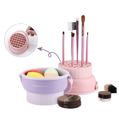 Tiene forma de cesta: en la parte inferior tiene rugosidades para lavar las brochas, y por el otro lado agujeros para poner a secar los pinceles húmedos.