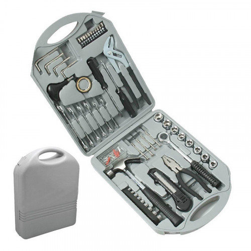 Presentamos este maletín de 141 piezas que incluye: alicates, martillo, cúter, destornilladores varios, diferentes llaves (de tuercas, inglesa, allen), tacos, tornillos, soportes de cable, etc.