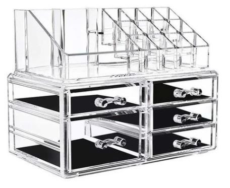Organizador acrílico de cosméticos con 5 cajones y diferentes compartimientos.