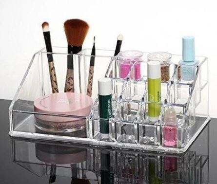 Tiene una parte superior con 12 espacios para labiales o pinceles y 4 espacios más para diferentes productos.