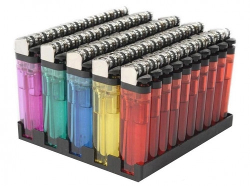 Este pack contiene 50 mecheros plásticos, transparentes de colores.