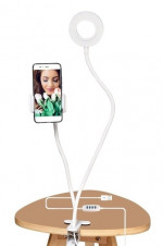 Se trata de un soporte de móvil con aro de luz LED incluido, con gancho tipo pinza para sujetarlo de la mesa o cualquier otro soporte.